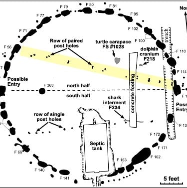 * Two possible animal offerings, a complete sea turtle carapace and the articulated remains of a shark more than six feet in length, were found within the Circle's interior. Each was oriented east-west, a practice often associated with prehistoric human burials.